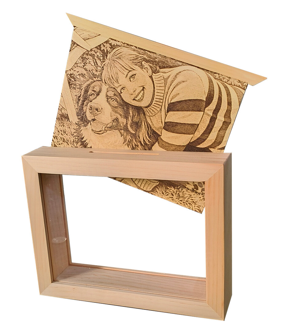 Dieses personalisierte Sparschwein vereint Dekoration und Funktionalität in einem warmen und modernen Design. Gefertigt aus Naturholz, verfügt es über eine transparente Plexiglasfront, die den Blick auf den Inhalt freigibt und gleichzeitig das personalisierte Foto auf der Rückseite perfekt in Szene setzt.